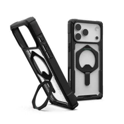 Etui wykonano z ultralekkiego kompozytu i czarnego zderzaka TPU (częściowo z materiałów z recyklingu). Antypoślizgowe krawędzie zapewniają pewny chwyt, a oversize’owe przyciski dają satysfakcjonujący, wyraźny klik. Ochronny rant wokół ekranu i aparatu to dodatkowe zabezpieczenie przed zarysowaniami w codziennym użytkowaniu.