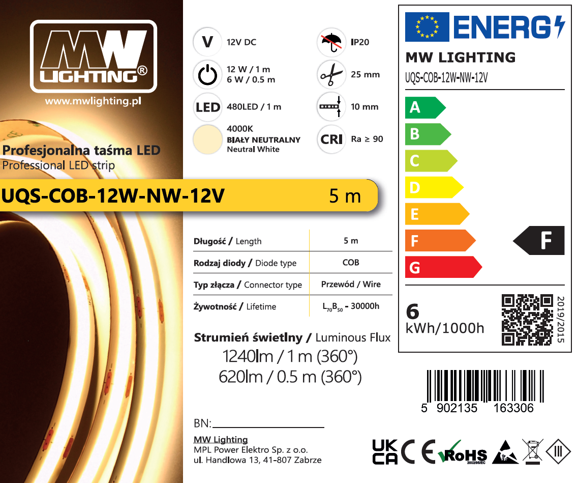 | Parametry | Profesjonalna taśma LED typu COB, 12W 480 chips/m, CRI >90, 12V, biala neutralna, 4000K, IP20, 5m |