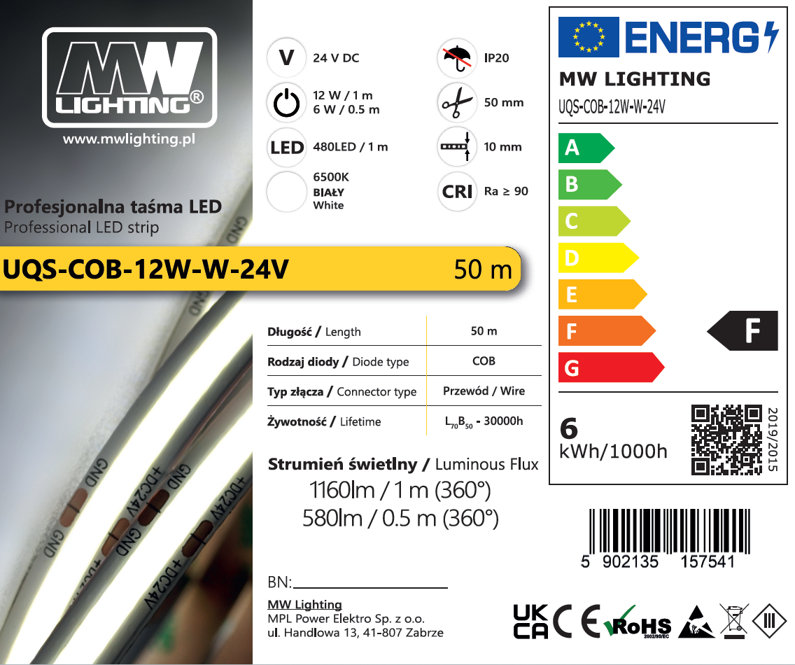 | Kod produktu | UQS-COB-12W-W-24V-50m |