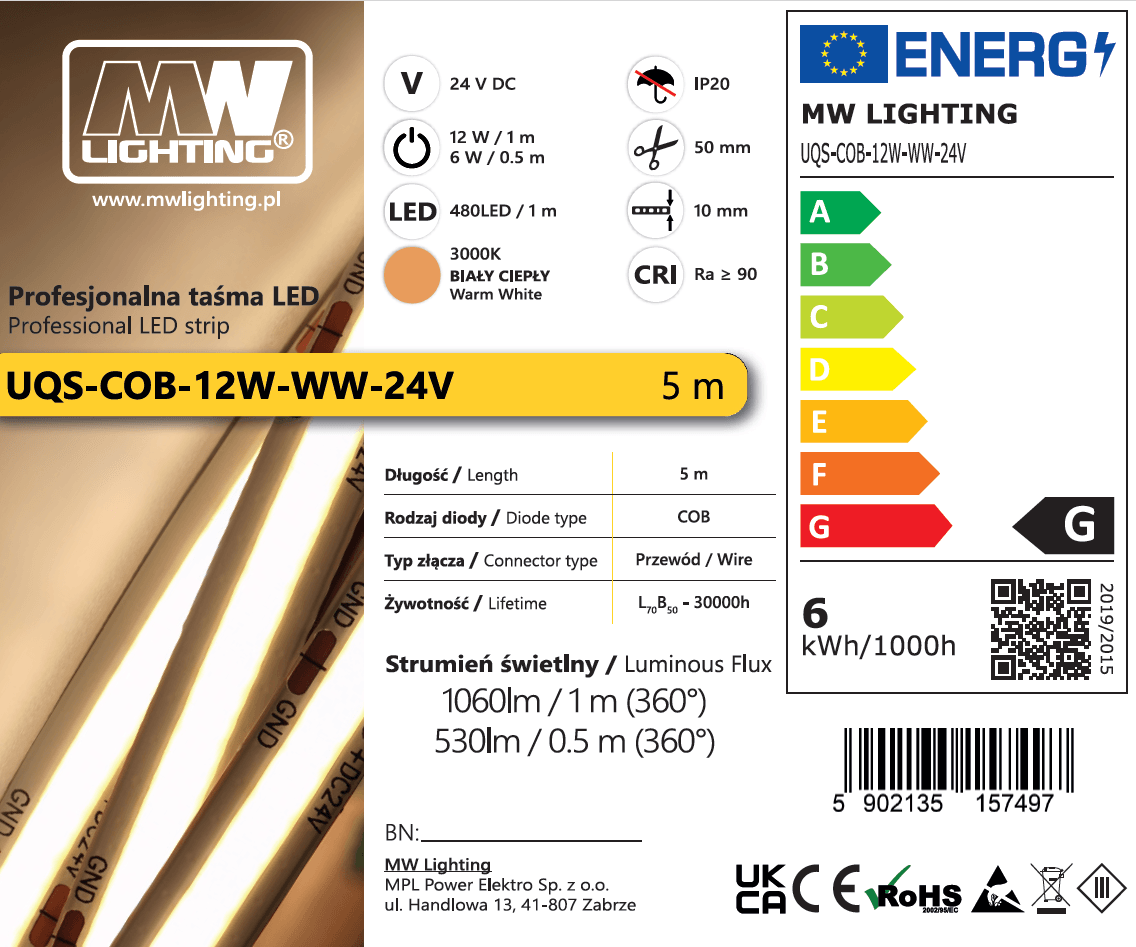 | Kod produktu | UQS-COB-12W-WW-24V-5m |