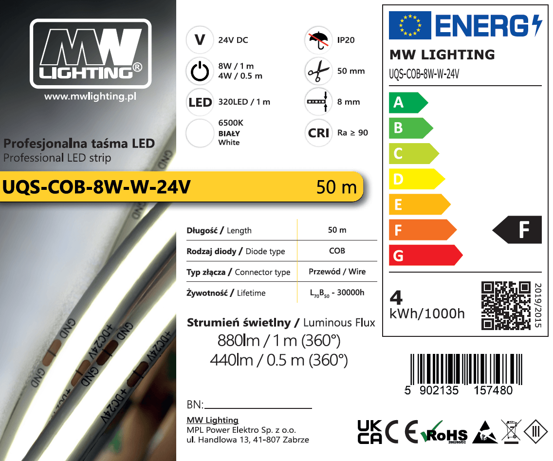 | Kod Produktu | UQS-COB-8W-W-24V-50m |
