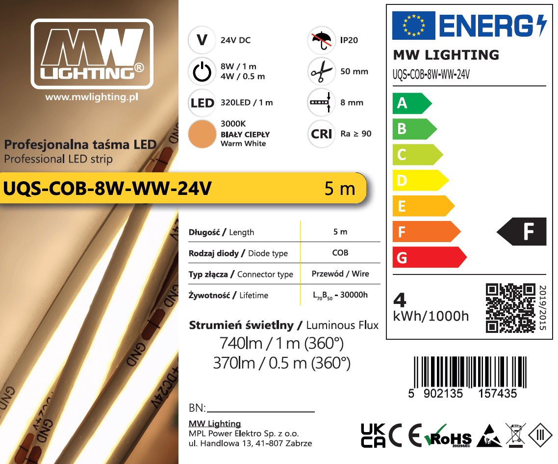 SKU: UQS-COB-8W-WW-24V-5m Kategorie: , , , Marka: EAN: 5902135157435