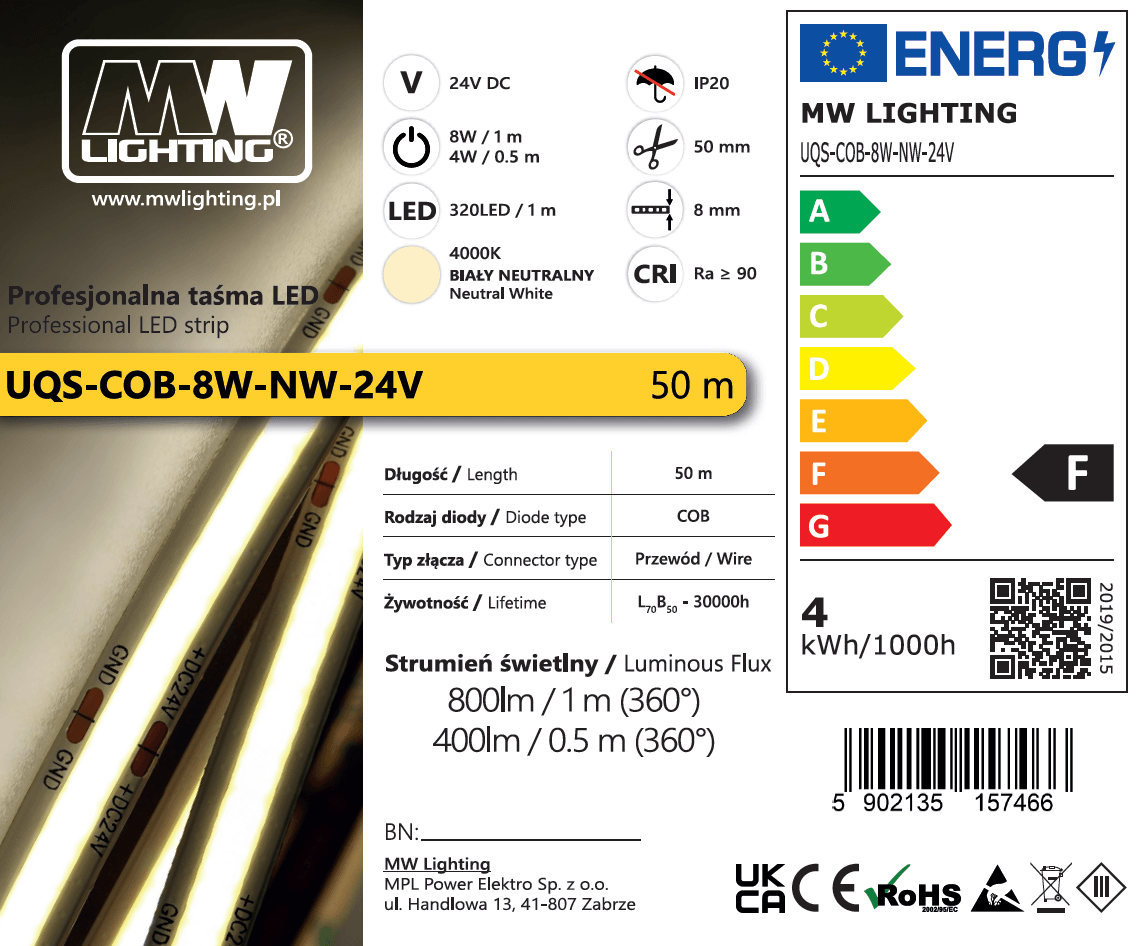 | Kod produktu | UQS-COB-8W-NW-24V-50m |