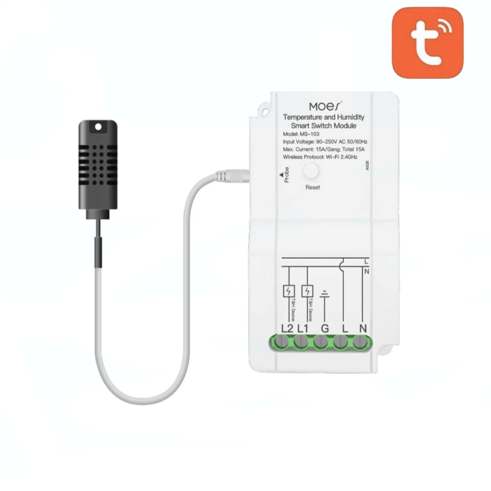 Dwukanałowy przekaźnik z czujnikiem temperatury i wilgotności Moes MS‑103‑TH łączy w jednym urządzeniu funkcję klasycznego sterownika i inteligentnego modułu WiFi, dzięki czemu pozwala zwiększyć komfort i bezpieczeństwo oraz obniżyć zużycie energii.